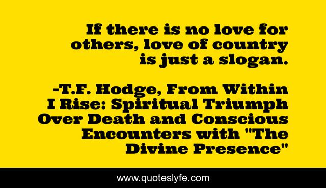 This page presents the quote "If there is no love for others, love of country is just a slogan.". Author of this quote is T.F. Hodge, From Within I Rise: Spiritual Triumph Over Death and Conscious Encounters with "The Divine Presence". This quote is about love, hypocrisy, country, peace, brotherly-love, patriots, human-kindness, patriotism, nationalism,.