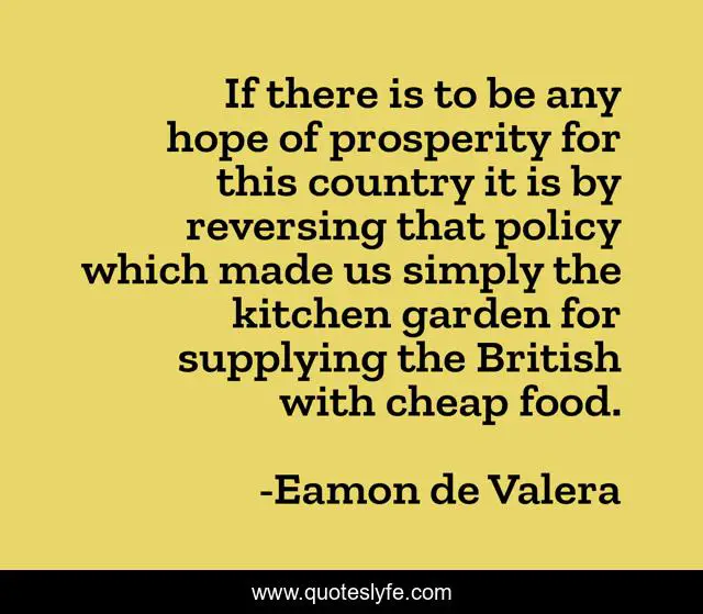 This page presents the quote "If there is to be any hope of prosperity for this country it is by reversing that policy which made us simply the kitchen garden for supplying the British with cheap food.". Author of this quote is Eamon de Valera. This quote is about food, garden, kitchen,.