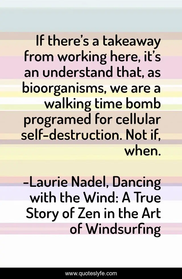 This page presents the quote "If there’s a takeaway from working here, it’s an understand that, as bioorganisms, we are a walking time bomb programed for cellular self-destruction. Not if, when.". Author of this quote is Laurie Nadel, Dancing with the Wind: A True Story of Zen in the Art of Windsurfing. This quote is about life, quote-of-the-day, dan-rather, wayne-dyer, inspirational, quote-about-life, enthusiasm, quotes-twitter, quote-of-the-week,.
