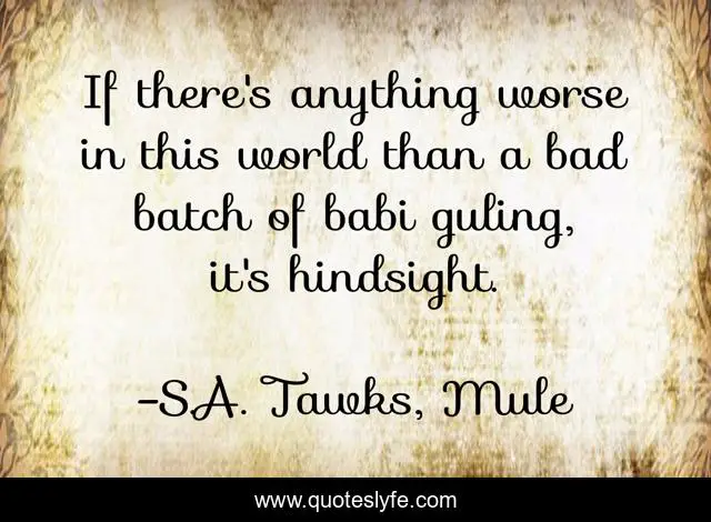 This page presents the quote "If there's anything worse in this world than a bad batch of babi guling, it's hindsight.". Author of this quote is S.A. Tawks, Mule. This quote is about motivation, bali, humour, advice, hindsight, comedy,.
