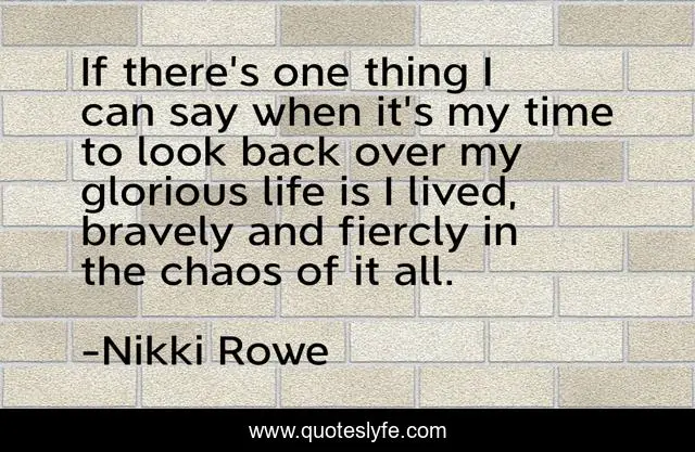 This page presents the quote "If there's one thing I can say when it's my time to look back over my glorious life is I lived, bravely and fiercly in the chaos of it all.". Author of this quote is Nikki Rowe. This quote is about the-now, brave-heart, grateful, concious, alive, raw, wild-and-free, truth, free-spirit,.