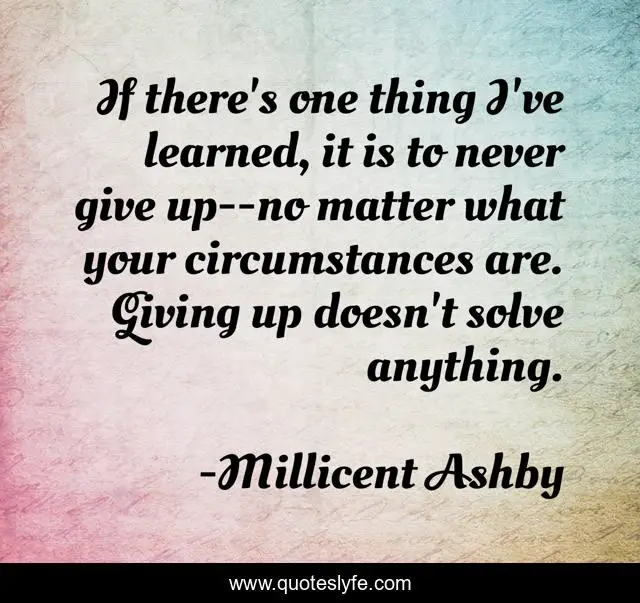 This page presents the quote "If there's one thing I've learned, it is to never give up--no matter what your circumstances are. Giving up doesn't solve anything.". Author of this quote is Millicent Ashby. This quote is about inspirational-attitude, strength-through-adversity, positive-thinking,.