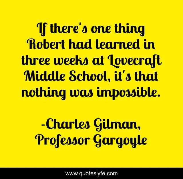 This page presents the quote "If there's one thing Robert had learned in three weeks at Lovecraft Middle School, it's that nothing was impossible.". Author of this quote is Charles Gilman, Professor Gargoyle. This quote is about fantasy, horror, weird-fiction, middle-grade,.