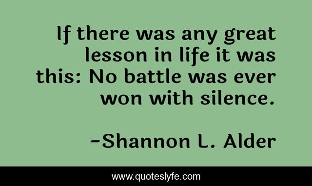 This page presents the quote "If there was any great lesson in life it was this: No battle was ever won with silence.". Author of this quote is Shannon L. Alder. This quote is about tsloama, ignoring, not-trusting, choices, decisions, trust, trials, battles, writers,.