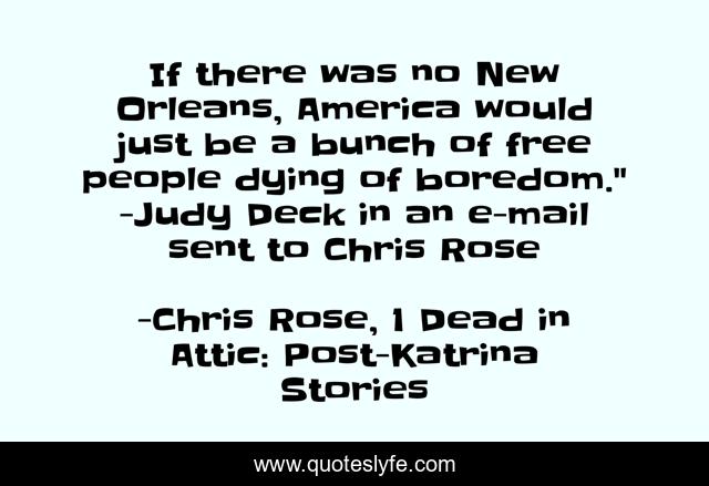 This page presents the quote "If there was no New Orleans, America would just be a bunch of free people dying of boredom." -Judy Deck in an e-mail sent to Chris Rose". Author of this quote is Chris Rose, 1 Dead in Attic: Post-Katrina Stories. This quote is about fun, freedom, america, new-orleans,.