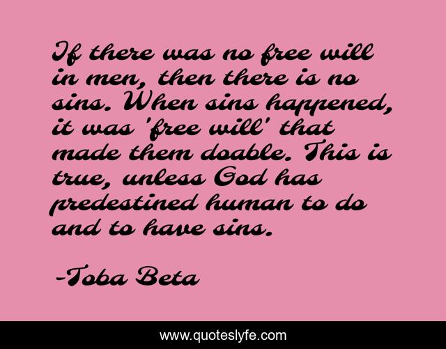 This page presents the quote "If there was no free will in men, then there is no sins. When sins happened, it was 'free will' that made them doable. This is true, unless God has predestined human to do and to have sins.". Author of this quote is Toba Beta. This quote is about life, god, free-will, sins, truth, clarity-of-perception,.