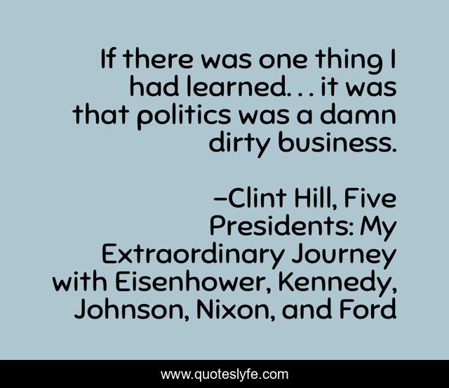 This page presents the quote "If there was one thing I had learned. . . it was that politics was a damn dirty business.". Author of this quote is Clint Hill, Five Presidents: My Extraordinary Journey with Eisenhower, Kennedy, Johnson, Nixon, and Ford. This quote is about politics, history, nonfiction, presidents,.