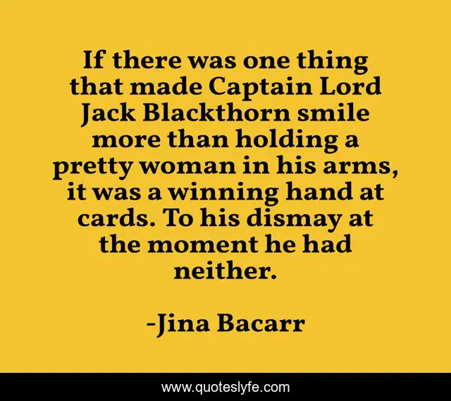 This page presents the quote "If there was one thing that made Captain Lord Jack Blackthorn smile more than holding a pretty woman in his arms, it was a winning hand at cards. To his dismay at the moment he had neither.". Author of this quote is Jina Bacarr. This quote is about romance, 1912, ship-of-dreams, titanic, historical,.