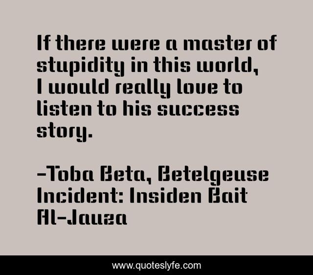 This page presents the quote "If there were a master of stupidity in this world, I would really love to listen to his success story.". Author of this quote is Toba Beta, Betelgeuse Incident: Insiden Bait Al-Jauza. This quote is about life, love, success, story, genius, stupidity, master, world, affection,.