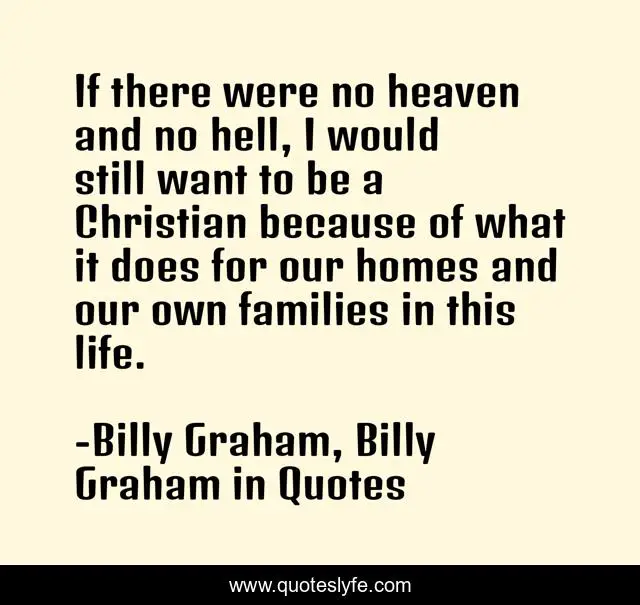 This page presents the quote "If there were no heaven and no hell, I would still want to be a Christian because of what it does for our homes and our own families in this life.". Author of this quote is Billy Graham, Billy Graham in Quotes. This quote is about home, billy-graham,.