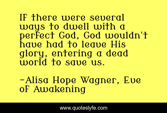 This page presents the quote "If there were several ways to dwell with a perfect God, God wouldn't have had to leave His glory, entering a dead world to save us.". Author of this quote is Alisa Hope Wagner, Eve of Awakening. This quote is about faith, christian, god, jesus,.