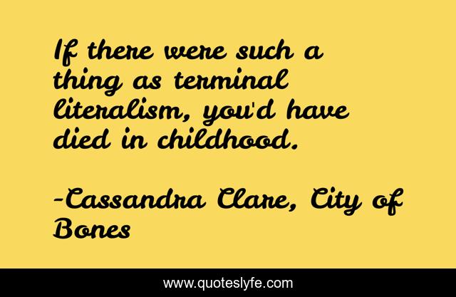 This page presents the quote "If there were such a thing as terminal literalism, you'd have died in childhood.". Author of this quote is Cassandra Clare, City of Bones. This quote is about god, jace-wayland, cassandra-clare, life, mortal-instruments,.