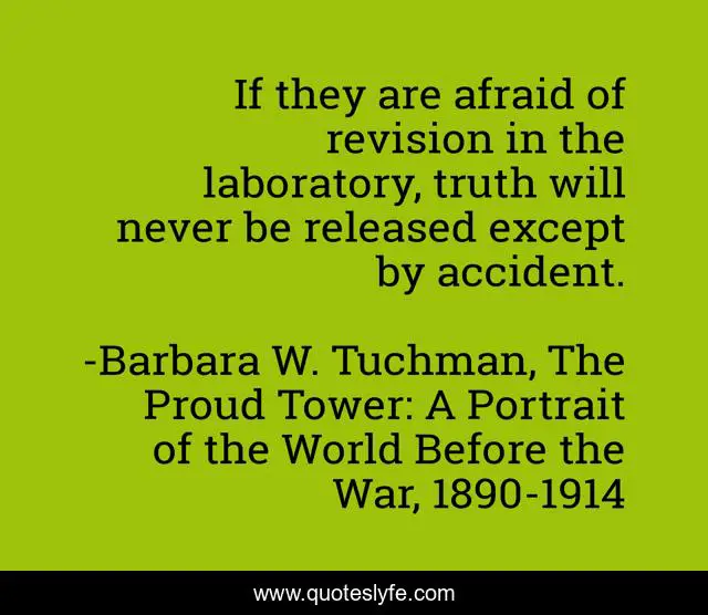 This page presents the quote "If they are afraid of revision in the laboratory, truth will never be released except by accident.". Author of this quote is Barbara W. Tuchman, The Proud Tower: A Portrait of the World Before the War, 1890-1914. This quote is about openness, humility,.