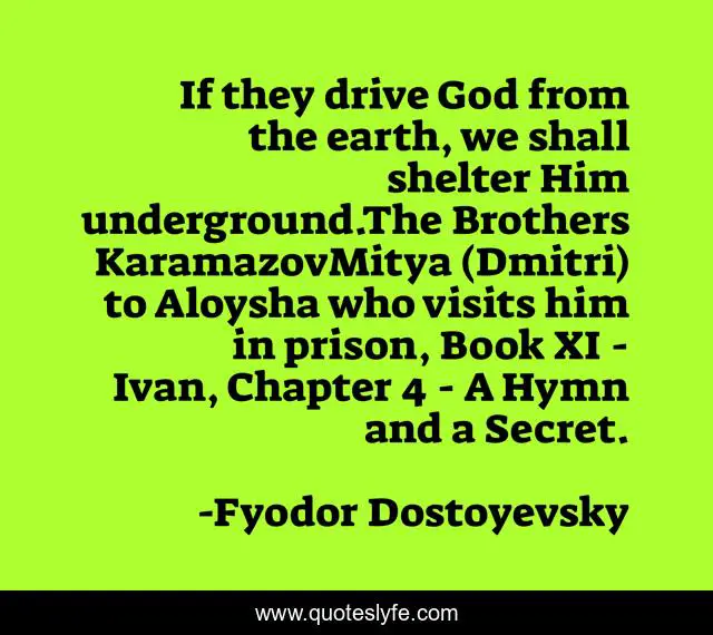 This page presents the quote "If they drive God from the earth, we shall shelter Him underground.The Brothers KaramazovMitya (Dmitri) to Aloysha who visits him in prison, Book XI - Ivan, Chapter 4 - A Hymn and a Secret.". Author of this quote is Fyodor Dostoyevsky. This quote is about conversion, holiness, god, the-brothers-karamazov, religion, truth,.