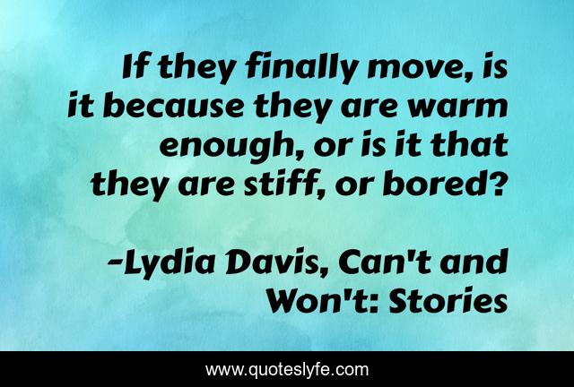 This page presents the quote "If they finally move, is it because they are warm enough, or is it that they are stiff, or bored?". Author of this quote is Lydia Davis, Can't and Won't: Stories. .