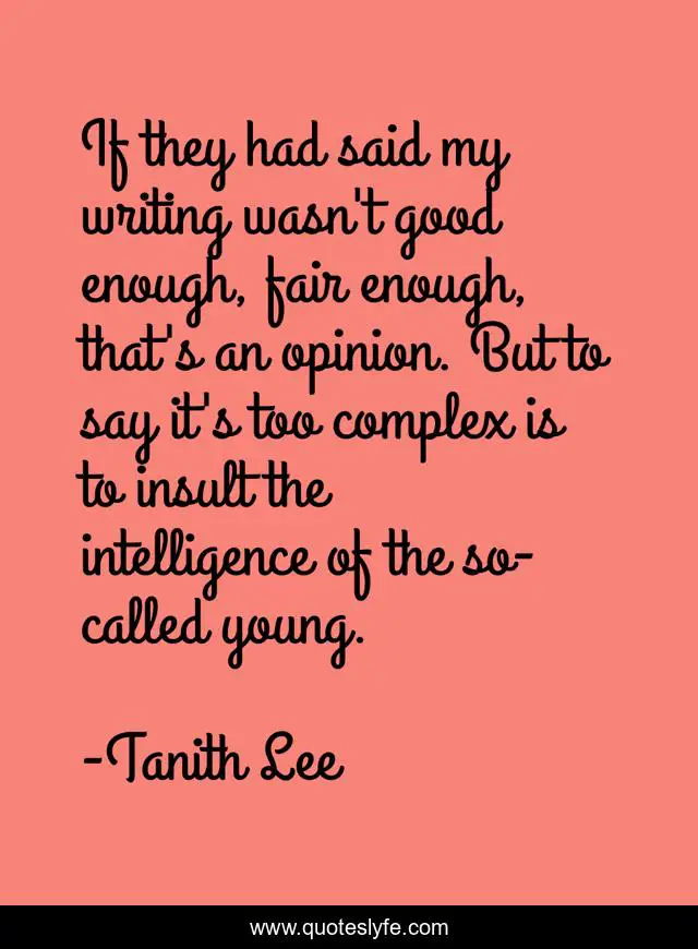 This page presents the quote "If they had said my writing wasn't good enough, fair enough, that's an opinion. But to say it's too complex is to insult the intelligence of the so-called young.". Author of this quote is Tanith Lee. This quote is about opinion, good, writing,.