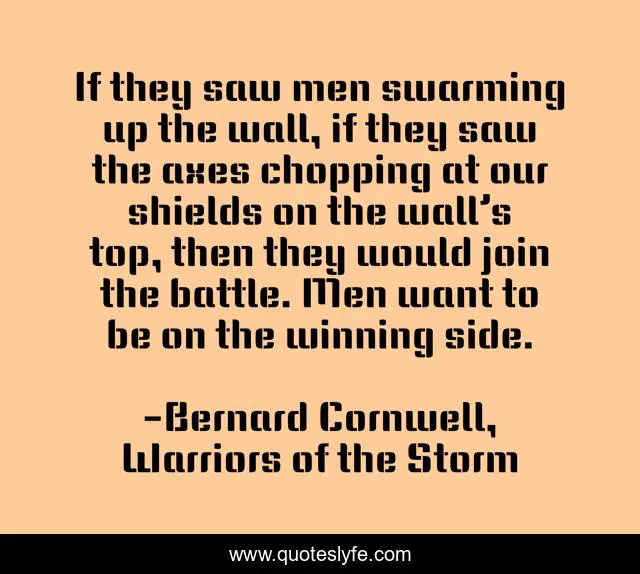 This page presents the quote "If they saw men swarming up the wall, if they saw the axes chopping at our shields on the wall’s top, then they would join the battle. Men want to be on the winning side.". Author of this quote is Bernard Cornwell, Warriors of the Storm. This quote is about battle, winner, shield-wall,.