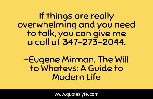 This page presents the quote "If things are really overwhelming and you need to talk, you can give me a call at 347-273-2044.". Author of this quote is Eugene Mirman, The Will to Whatevs: A Guide to Modern Life. This quote is about talking, advice, humor, support,.