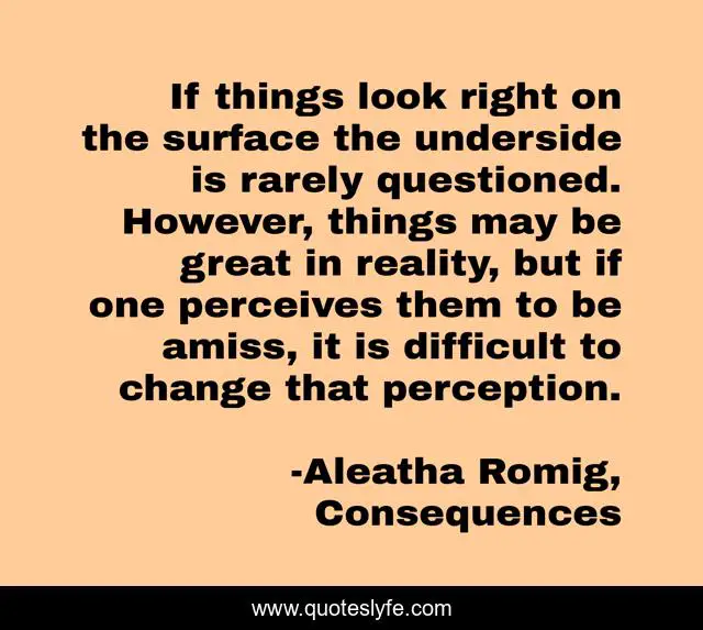 This page presents the quote "If things look right on the surface the underside is rarely questioned. However, things may be great in reality, but if one perceives them to be amiss, it is difficult to change that perception.". Author of this quote is Aleatha Romig, Consequences. This quote is about perception, appearance, surface, reality,.