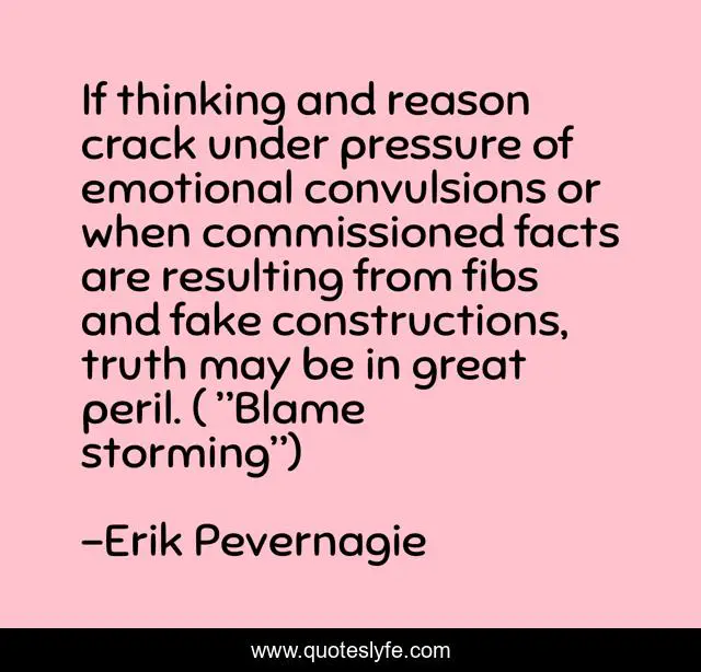 This page presents the quote "If thinking and reason crack under pressure of emotional convulsions or when commissioned facts are resulting from fibs and fake constructions, truth may be in great peril. ( ”Blame storming”)". Author of this quote is Erik Pevernagie. This quote is about constructions, thinking, crack, under, blame-storming, fibs, emotional, pressure, reason,.