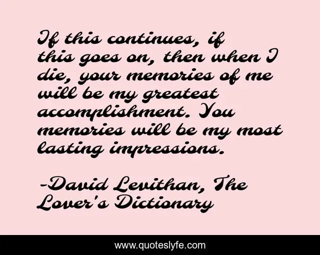 This page presents the quote "If this continues, if this goes on, then when I die, your memories of me will be my greatest accomplishment. You memories will be my most lasting impressions.". Author of this quote is David Levithan, The Lover's Dictionary. This quote is about memories, death, lovers,.