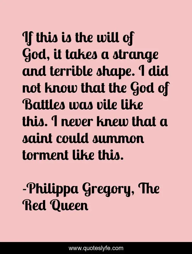 This page presents the quote "If this is the will of God, it takes a strange and terrible shape. I did not know that the God of Battles was vile like this. I never knew that a saint could summon torment like this.". Author of this quote is Philippa Gregory, The Red Queen. This quote is about will-of-god, joan-of-arc, death, war, destruction,.