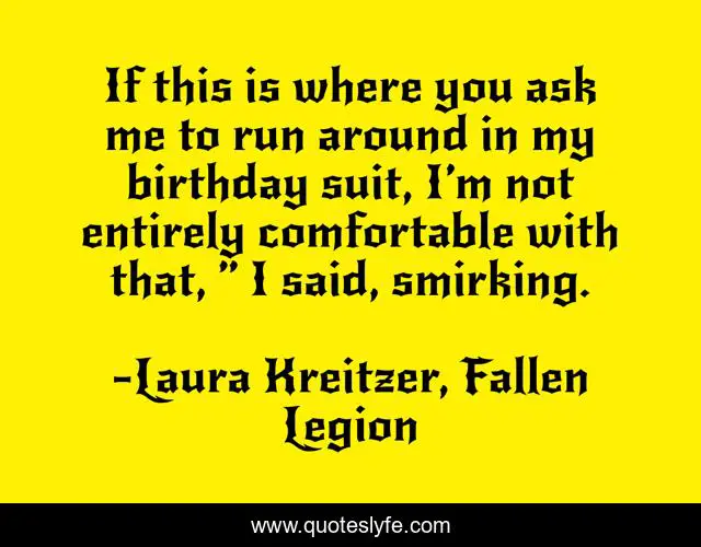 This page presents the quote "If this is where you ask me to run around in my birthday suit, I’m not entirely comfortable with that, ” I said, smirking.". Author of this quote is Laura Kreitzer, Fallen Legion. This quote is about urban-fantasy-romance, fiction, fantasy, urban-fantasy-series, humor, angels,.