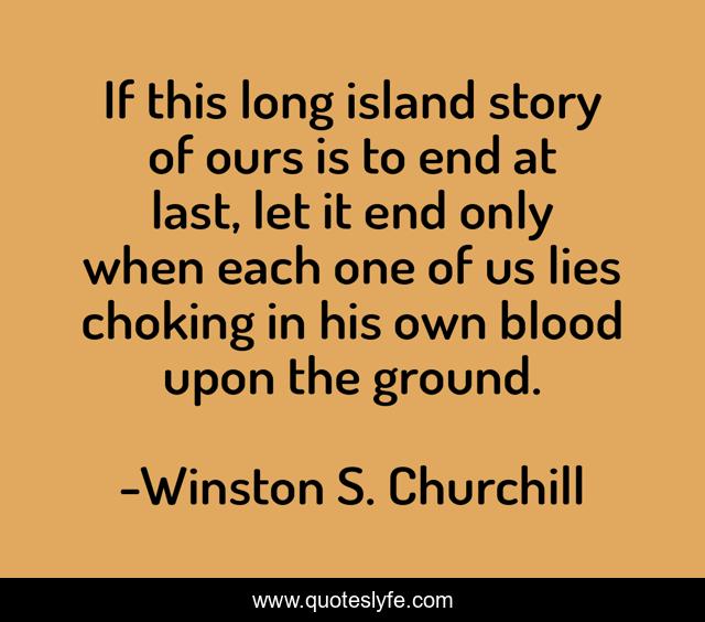 This page presents the quote "If this long island story of ours is to end at last, let it end only when each one of us lies choking in his own blood upon the ground.". Author of this quote is Winston S. Churchill. This quote is about politics, war, history,.