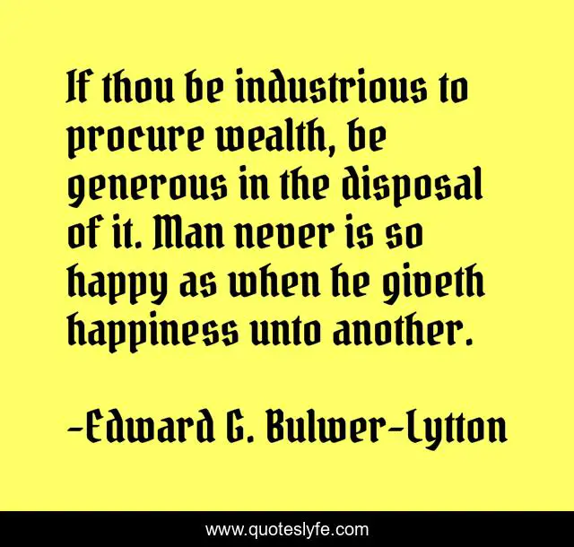 This page presents the quote "If thou be industrious to procure wealth, be generous in the disposal of it. Man never is so happy as when he giveth happiness unto another.". Author of this quote is Edward G. Bulwer-Lytton. This quote is about happy, wealth, man,.