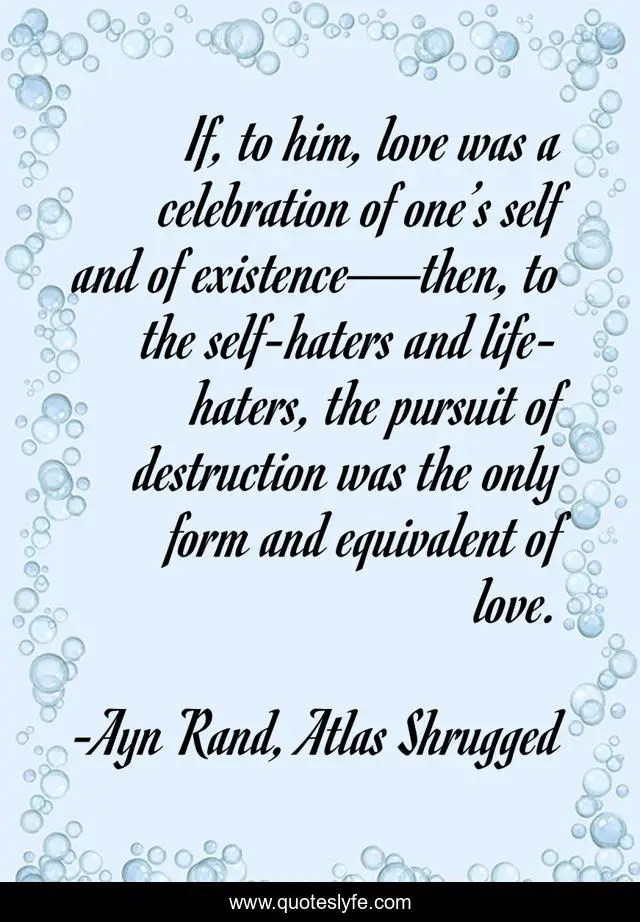 This page presents the quote "If, to him, love was a celebration of one’s self and of existence—then, to the self-haters and life-haters, the pursuit of destruction was the only form and equivalent of love.". Author of this quote is Ayn Rand, Atlas Shrugged. This quote is about hank-rearden, self, atlas-shrugged, love, affection,.