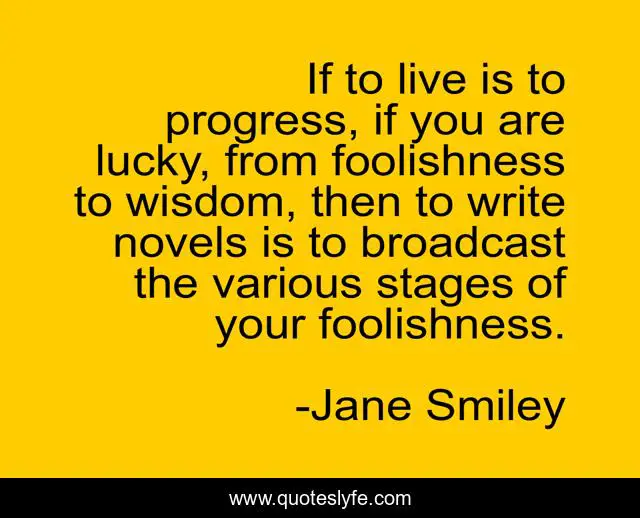This page presents the quote "If to live is to progress, if you are lucky, from foolishness to wisdom, then to write novels is to broadcast the various stages of your foolishness.". Author of this quote is Jane Smiley. This quote is about progress, live,.