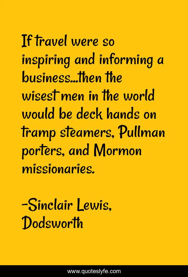 This page presents the quote "If travel were so inspiring and informing a business...then the wisest men in the world would be deck hands on tramp steamers, Pullman porters, and Mormon missionaries.". Author of this quote is Sinclair Lewis, Dodsworth. This quote is about travel, humor,.