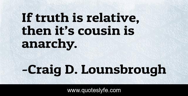 This page presents the quote "If truth is relative, then it’s cousin is anarchy.". Author of this quote is Craig D. Lounsbrough. This quote is about misdirection, misdirected, disorientation, honesty, confusion, honest, relative, lies, fact,.
