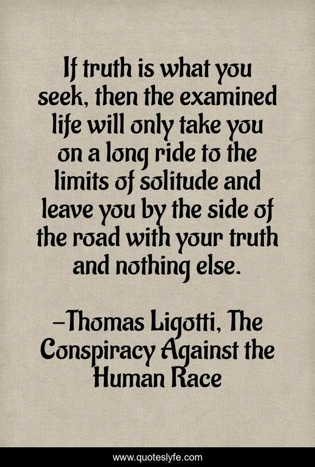 This page presents the quote "If truth is what you seek, then the examined life will only take you on a long ride to the limits of solitude and leave you by the side of the road with your truth and nothing else.". Author of this quote is Thomas Ligotti, The Conspiracy Against the Human Race. This quote is about limits, seeking, ride, solitude, examined-life, truth, nothing, seek, road,.