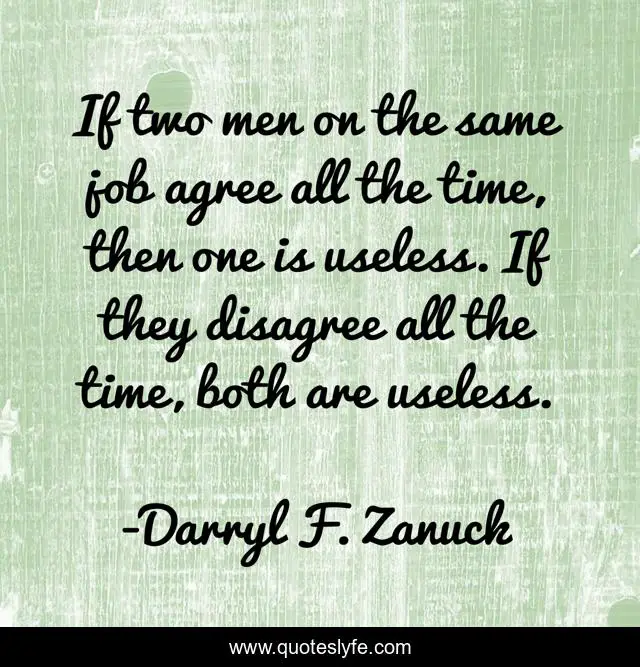 This page presents the quote "If two men on the same job agree all the time, then one is useless. If they disagree all the time, both are useless.". Author of this quote is Darryl F. Zanuck. This quote is about jobs, work, teamwork, argument, business,.