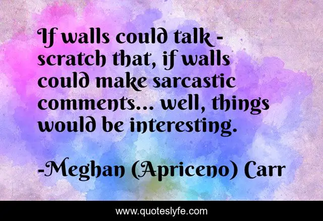 This page presents the quote "If walls could talk - scratch that, if walls could make sarcastic comments... well, things would be interesting.". Author of this quote is Meghan (Apriceno) Carr. This quote is about faith, girl, love-story, sarcasm,.