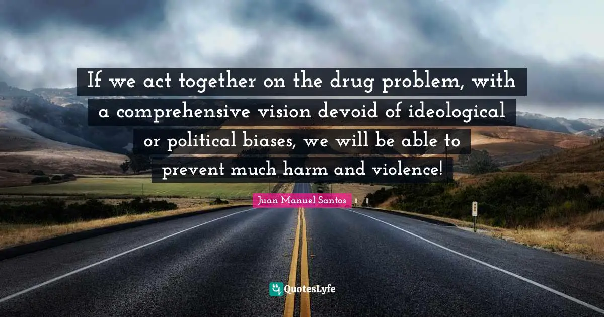 This page presents the quote "If we act together on the drug problem, with a comprehensive vision devoid of ideological or political biases, we will be able to prevent much harm and violence!". Author of this quote is Juan Manuel Santos. This quote is about problem, vision, able, violence, harm, drug, together, comprehensive, political,.
