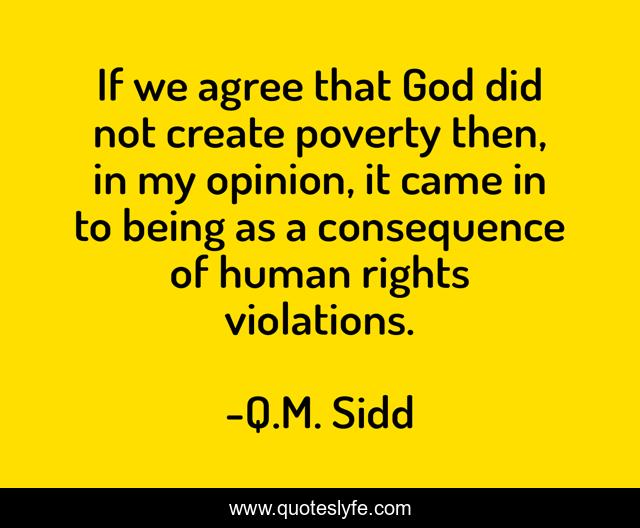 This page presents the quote "If we agree that God did not create poverty then, in my opinion, it came in to being as a consequence of human rights violations.". Author of this quote is Q.M. Sidd. This quote is about life, poverty, philosophy-of-life, poverty-inequality,.