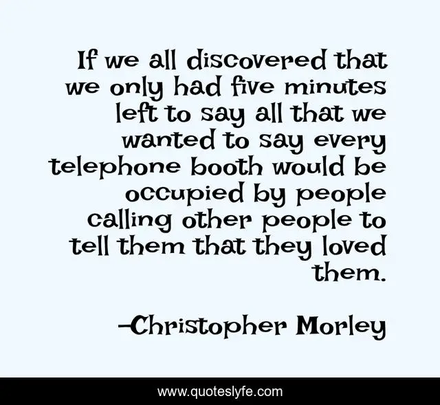 This page presents the quote "If we all discovered that we only had five minutes left to say all that we wanted to say every telephone booth would be occupied by people calling other people to tell them that they loved them.". Author of this quote is Christopher Morley. .