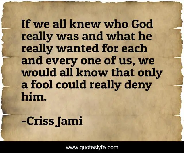 This page presents the quote "If we all knew who God really was and what he really wanted for each and every one of us, we would all know that only a fool could really deny him.". Author of this quote is Criss Jami. This quote is about life, love, knowing-god, foolishness, apologetics, goodness-of-god, goodness, god, worship,.
