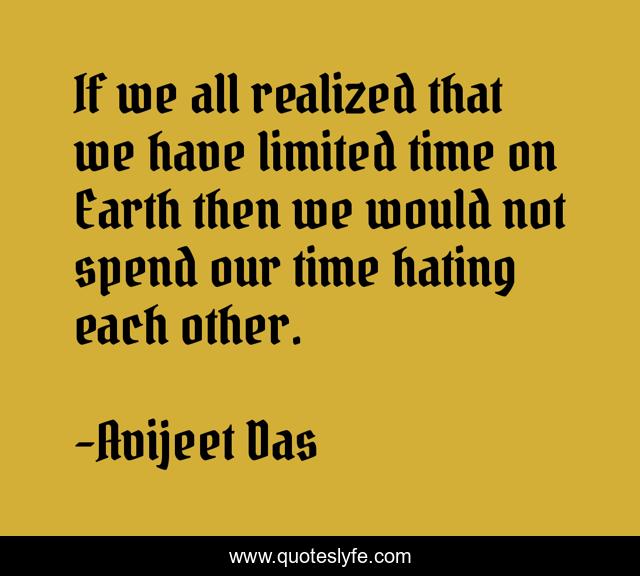 This page presents the quote "If we all realized that we have limited time on Earth then we would not spend our time hating each other.". Author of this quote is Avijeet Das. This quote is about life, love, one-world, earth, humanity, affection,.