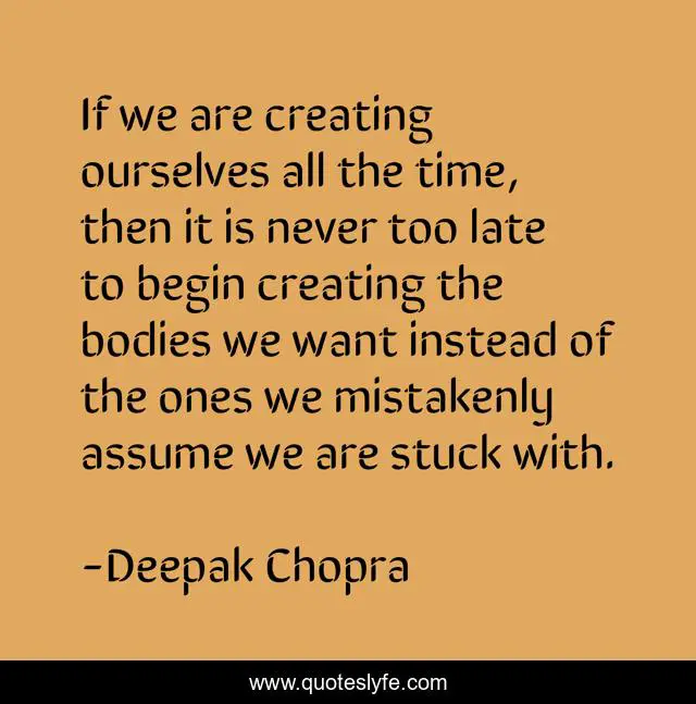 This page presents the quote "If we are creating ourselves all the time, then it is never too late to begin creating the bodies we want instead of the ones we mistakenly assume we are stuck with.". Author of this quote is Deepak Chopra. .
