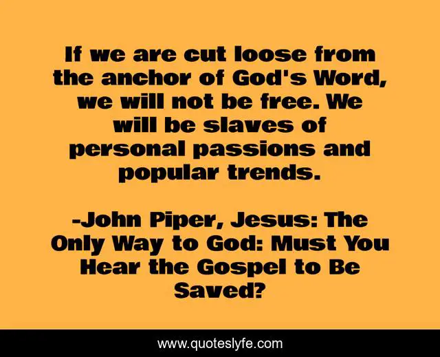 This page presents the quote "If we are cut loose from the anchor of God's Word, we will not be free. We will be slaves of personal passions and popular trends.". Author of this quote is John Piper, Jesus: The Only Way to God: Must You Hear the Gospel to Be Saved?. This quote is about discipleship, christian,.