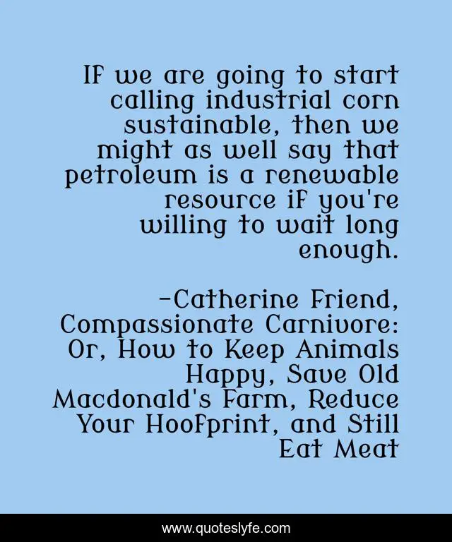 This page presents the quote "If we are going to start calling industrial corn sustainable, then we might as well say that petroleum is a renewable resource if you're willing to wait long enough.". Author of this quote is Catherine Friend, Compassionate Carnivore: Or, How to Keep Animals Happy, Save Old Macdonald's Farm, Reduce Your Hoofprint, and Still Eat Meat. This quote is about food, sustainability, humor,.