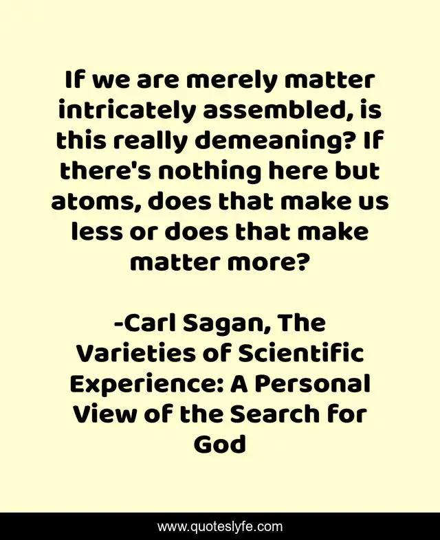 This page presents the quote "If we are merely matter intricately assembled, is this really demeaning? If there's nothing here but atoms, does that make us less or does that make matter more?". Author of this quote is Carl Sagan, The Varieties of Scientific Experience: A Personal View of the Search for God. This quote is about biology, belief, science, philosophy, religion, philosophy-of-life,.
