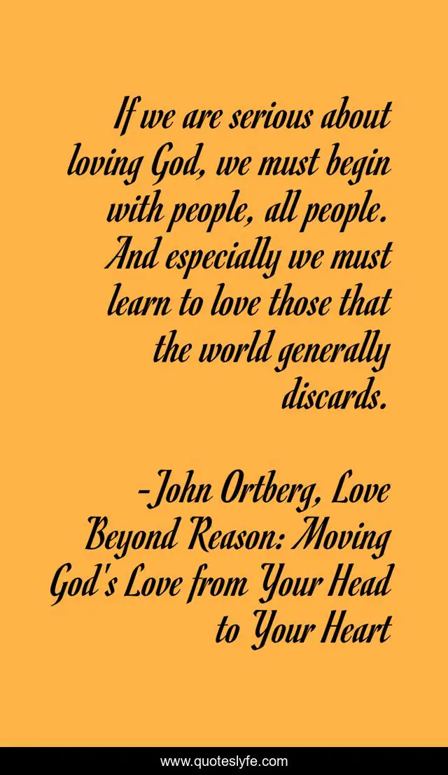 This page presents the quote "If we are serious about loving God, we must begin with people, all people. And especially we must learn to love those that the world generally discards.". Author of this quote is John Ortberg, Love Beyond Reason: Moving God's Love from Your Head to Your Heart. This quote is about god, love, christian, affection, christianity,.