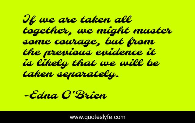 This page presents the quote "If we are taken all together, we might muster some courage, but from the previous evidence it is likely that we will be taken separately.". Author of this quote is Edna O'Brien. This quote is about child-abuse, genocide, rape-survivor,.