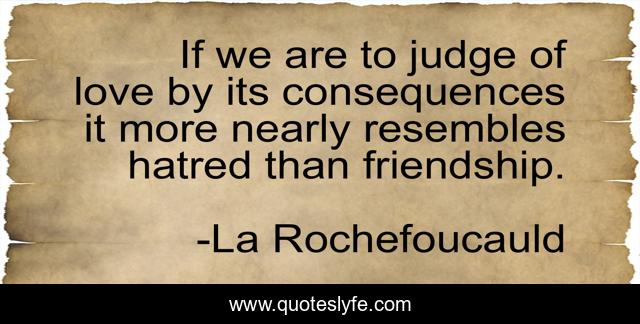 This page presents the quote "If we are to judge of love by its consequences it more nearly resembles hatred than friendship.". Author of this quote is La Rochefoucauld. This quote is about love, affection,.