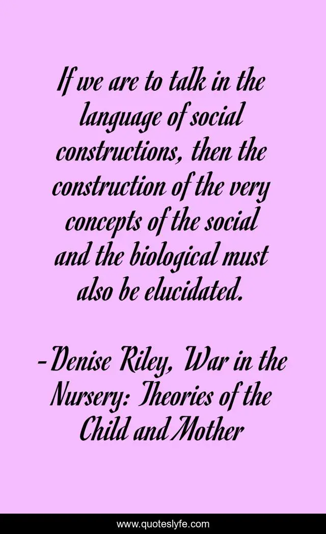 This page presents the quote "If we are to talk in the language of social constructions, then the construction of the very concepts of the social and the biological must also be elucidated.". Author of this quote is Denise Riley, War in the Nursery: Theories of the Child and Mother. This quote is about biologism, denise-riley, concepts, social-construct, social, war-in-the-nursery, riley,.