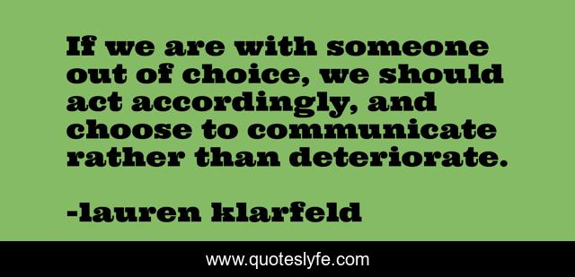This page presents the quote "If we are with someone out of choice, we should act accordingly, and choose to communicate rather than deteriorate.". Author of this quote is lauren klarfeld. This quote is about relationships, love, mindfulness, communication, communication-skills, choices, mindfulness-practice, deterioration, affection,.